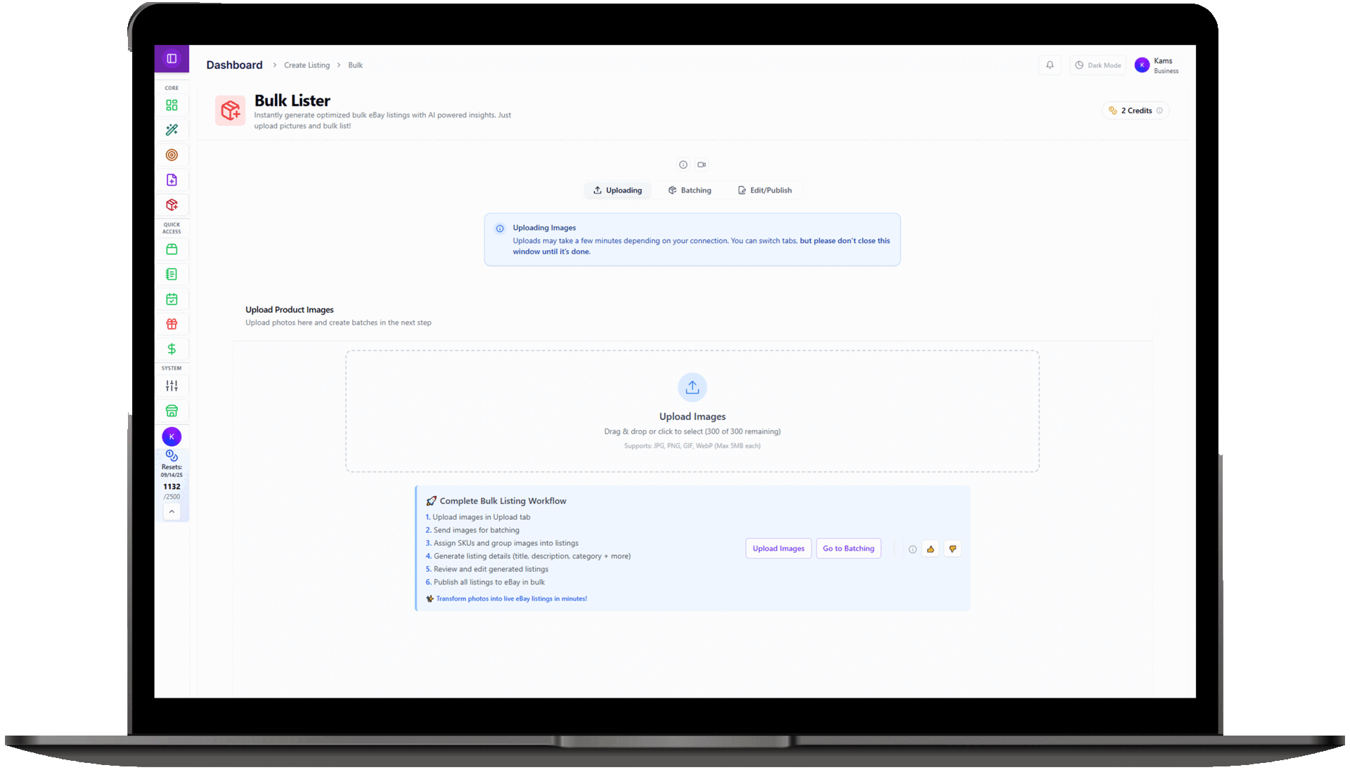 Create dozens or hundreds of eBay listings at once! Upload all your product photos, group them into batches, and publish in minutes.